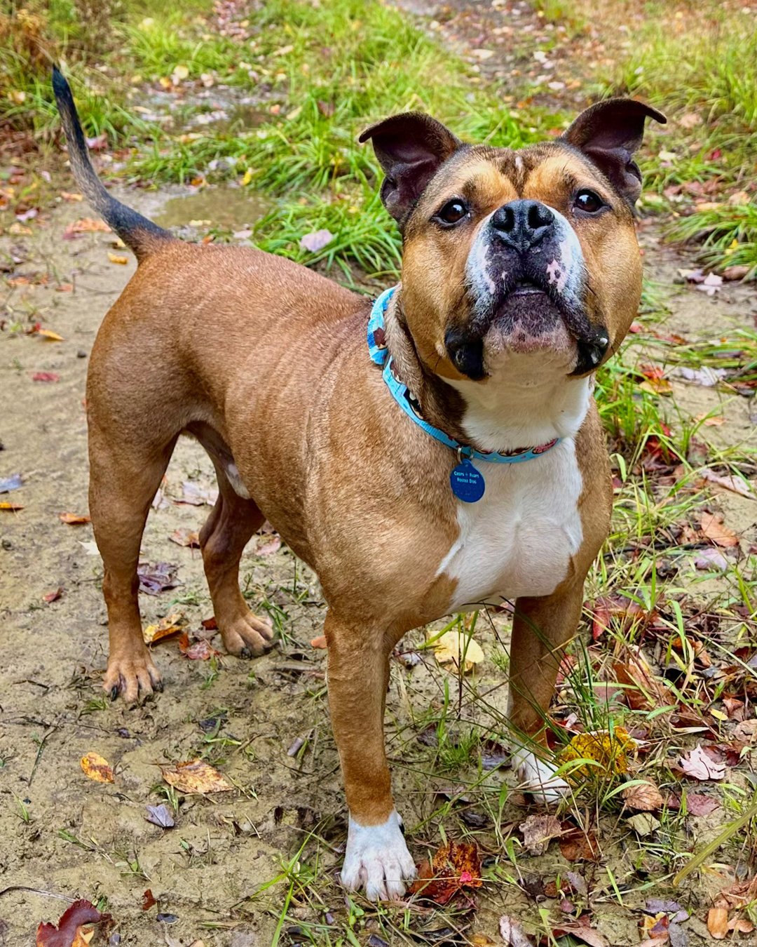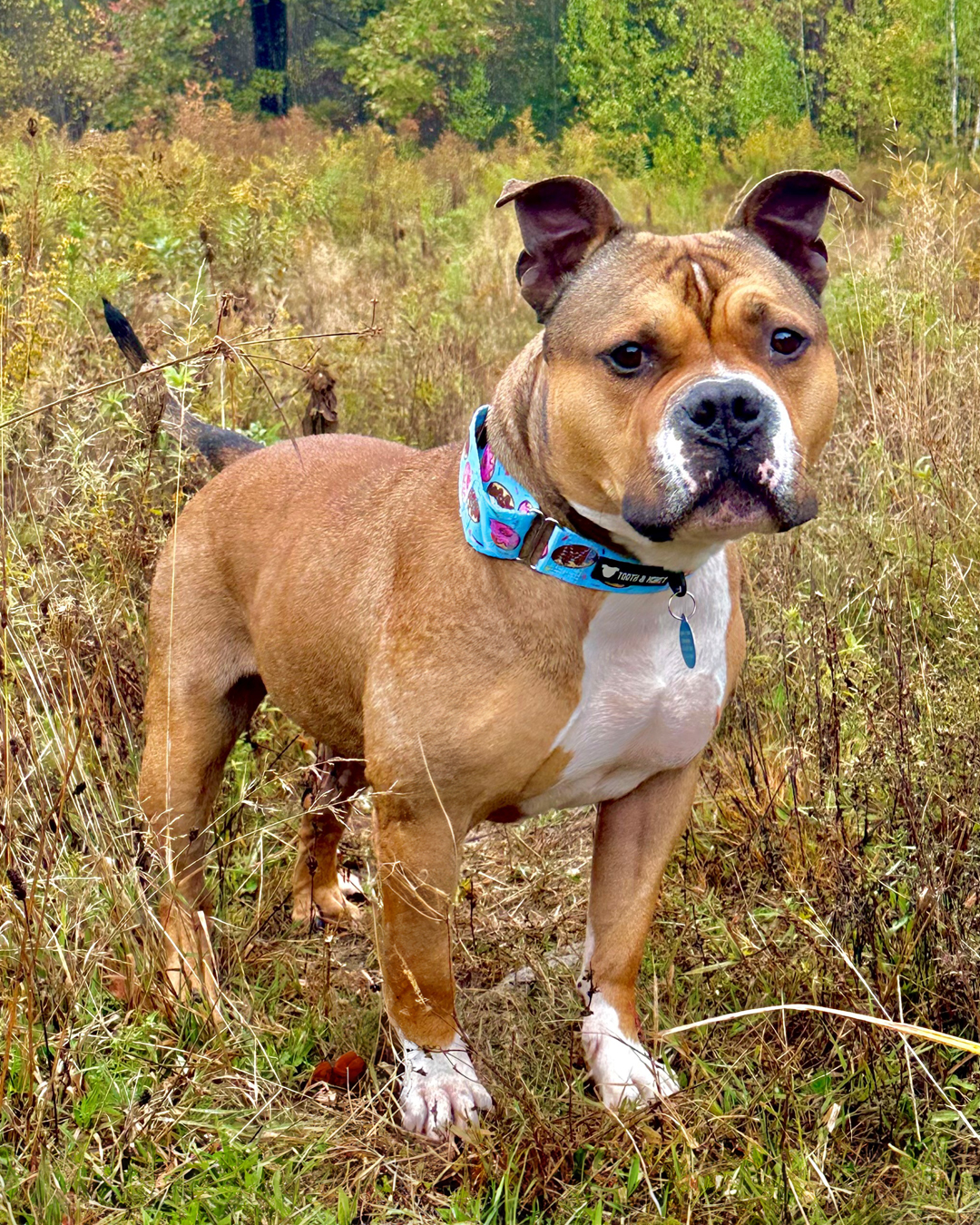 Tater is an excellent co-pilot in the car, walks well on leash (but can pull to get to a canine friend), is totally housebroken, and has been super easy to care for. Our sweet Skater Tater has verrrrrry short bursts of “speed” (we use that term liberally), followed by lazing around. He is dog-friendly and was reported to live with kids (cats unknown). Our resident Mr. Potato Head tap dances for food or affection, and with his large frame, reminds us of a bully-inspired Riverdance. And our Tater Gator does have a stubborn streak in true bulldog fashion. He will make dinosaur noises if he doesn’t want to do something. Wait – he will make gremlin snorts throughout the day and can snore like a lumberjack, too. So, he can make a LOT of noises. When he’s happy, this baked potato will do a series of 3-second micro-burst zoomies…then…time for a rest. We are in LOVE! Due to his size, and lack of history, older or no kids would be best for this handsome hot potato.