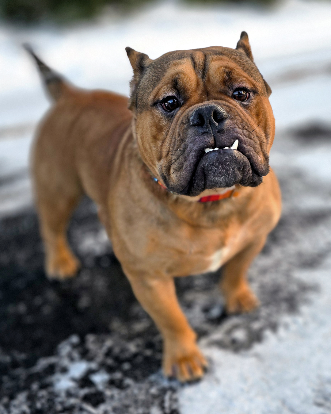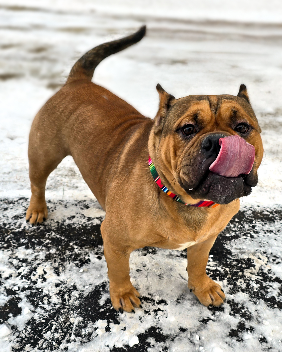 Wookiee is a typical social puppy who loves to be close to the action and snuggle. He is a happy-go-lucky man who has the best tail wagging range of motion we have ever seen, slapping the sides of his body with every wag. And his noises…bulldog perfection (IYKYK)! Our vertically-challenged man is a 65-lb super chunk and covered in beautiful tri-color shades of furry brown. He also purrs like a kitten, has a tender heart, and is extra squish-tastic. We call him Chewbacca or Chewie because he loves to chew on nylabones (and snacks!) with gusto. He is wonderfully quiet in the car…we’re guessing he learned his co-pilot skills aboard the Millennium Falcon. And in typical Wookiee fashion, our man values honor and friendship above all else. He would make an excellent companion for a family looking for love.